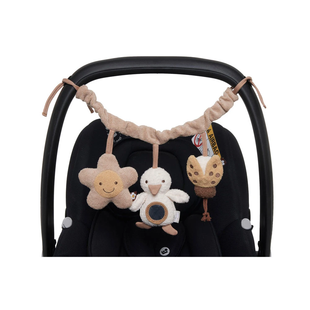 Dit is een schattige en kleurrijke wagenspanner die perfect is om je baby te vermaken. De ketting heeft drie zachte speeltjes: een bloem, een eend en een lieveheersbeestje. Alle speeltjes hebben een knisperend element dat je baby bezig zal houden.