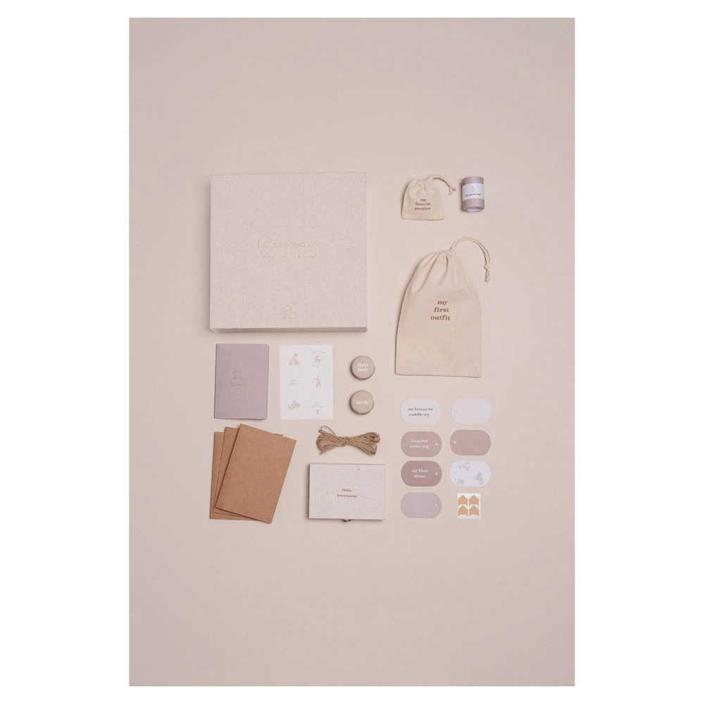 - Opbergdoos met opbergzakken, meetlint, opbergdozen, enveloppen, labels, een boekje en touw.