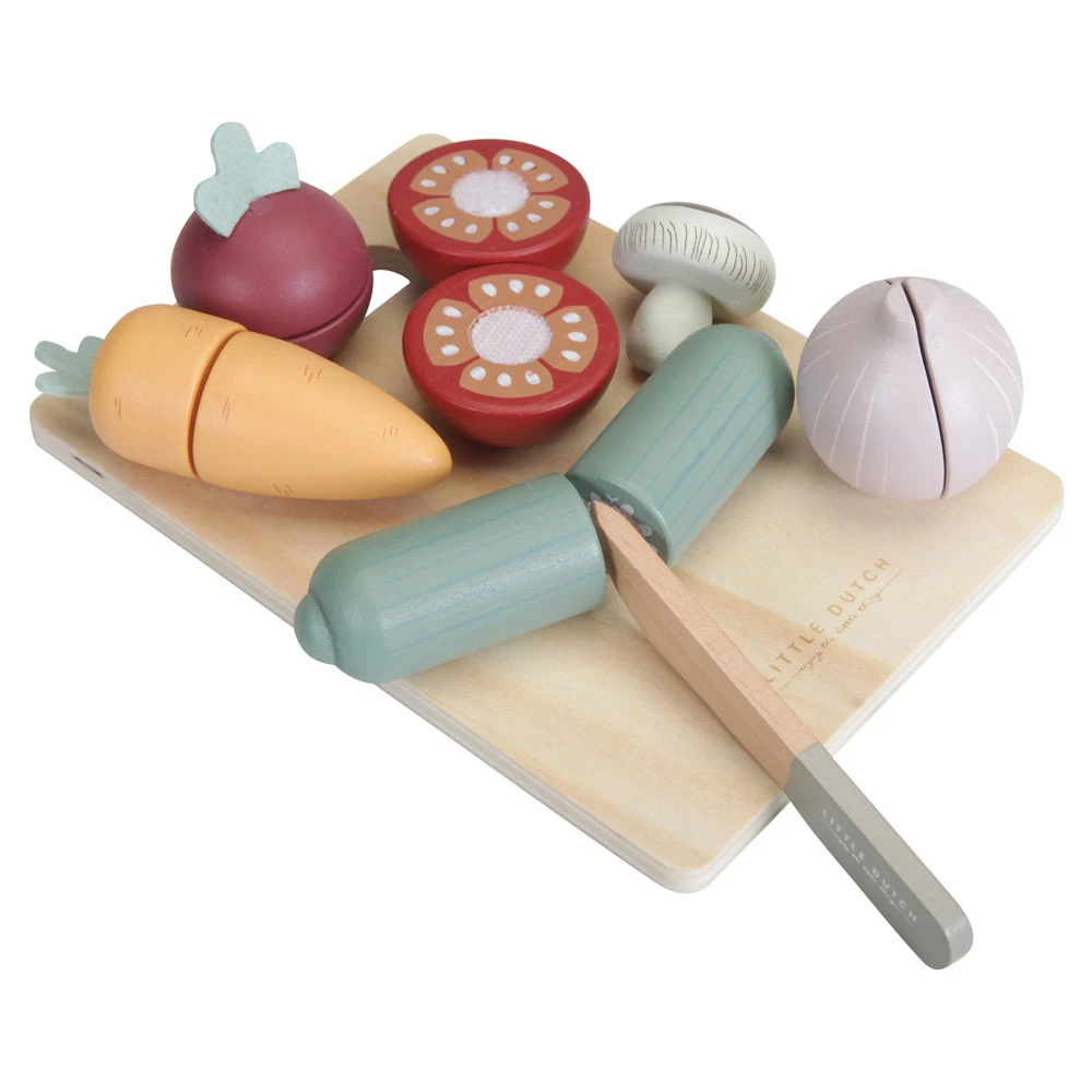 - Bevat zes verschillende groenten, een snijplankje en een mesje.