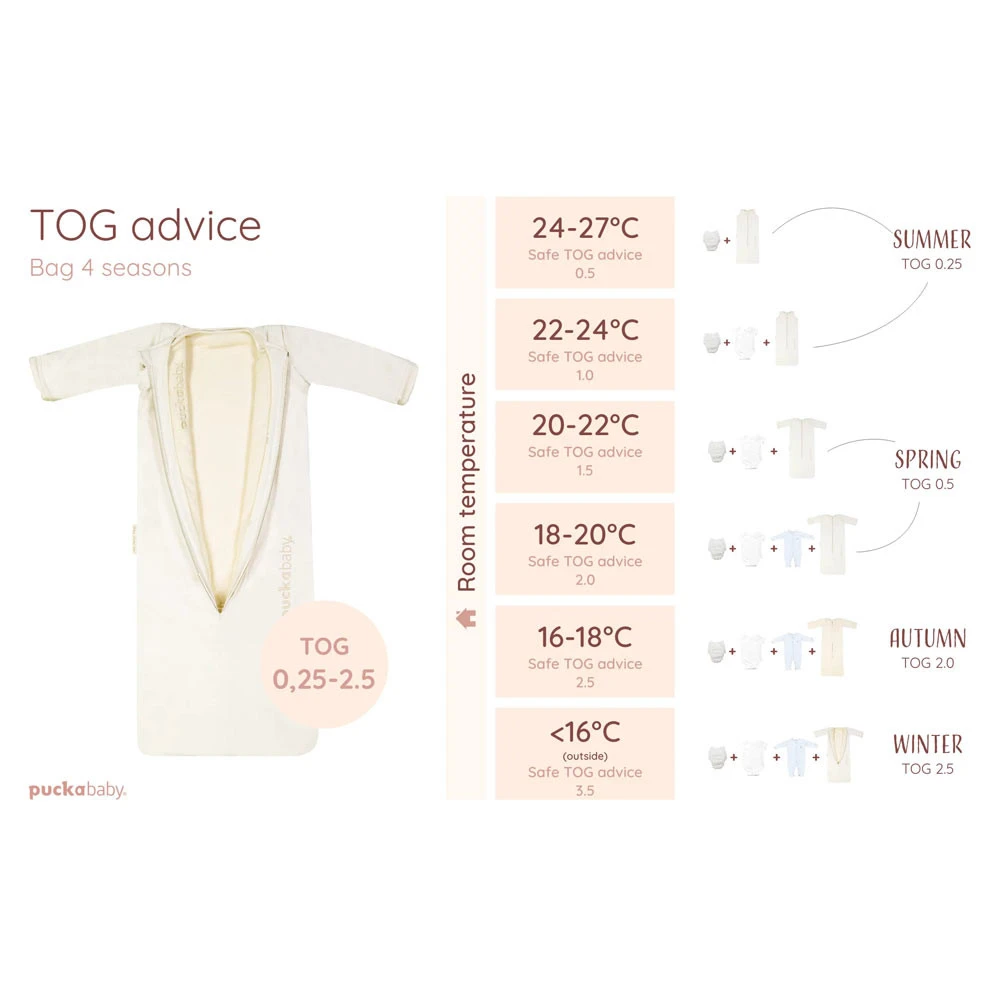 - Lente: gebruik alleen de katoenen buitenzak in de lente. Rits de slaapzak open en haal de teddy binnenzak er uit. Zo heeft de slaapzak een TOG-waarde van 0.5.